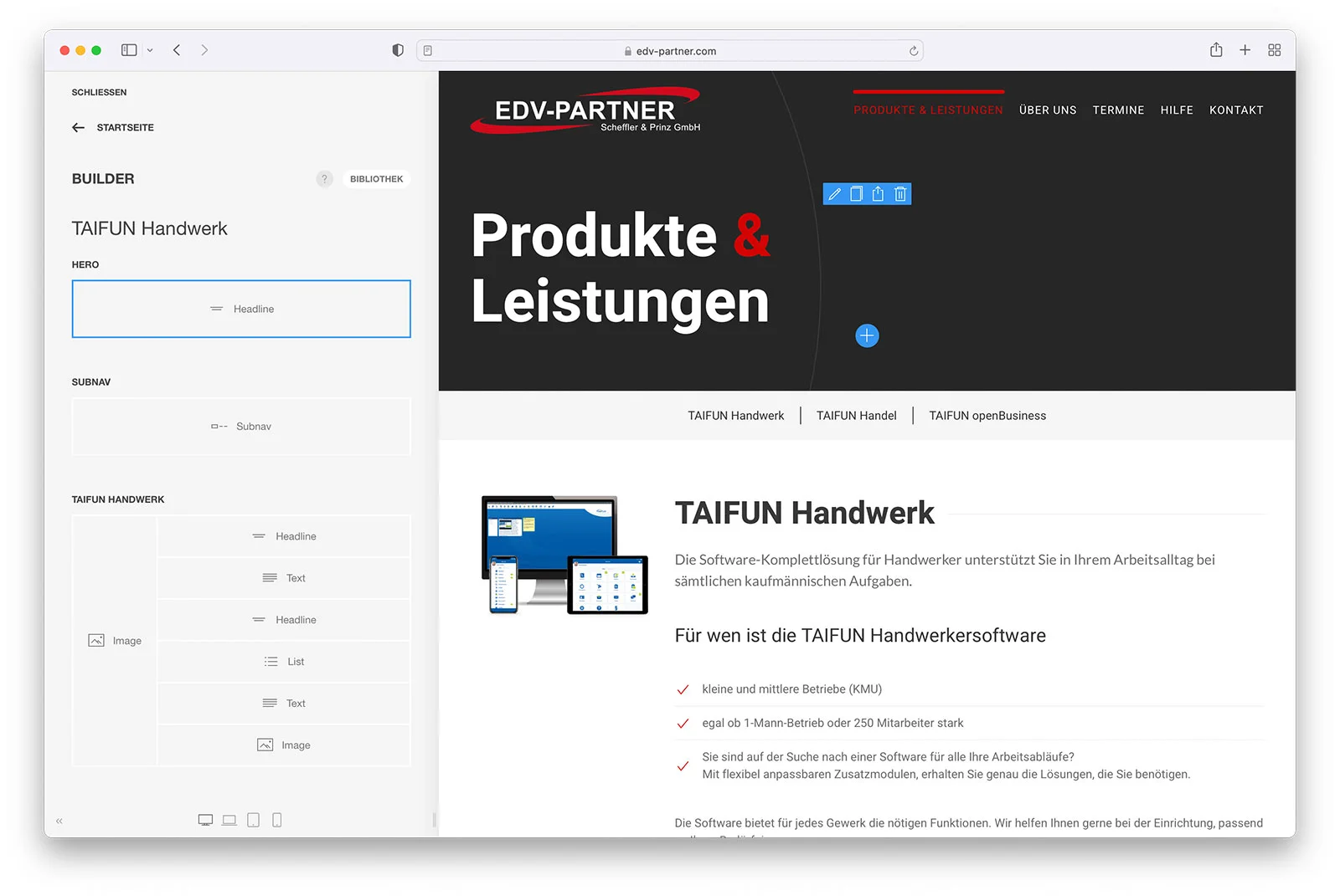 Mit unserem eigenen Homepage-Baukasten bieten wir Ihnen weiterhin die Möglichkeit, auch ohne Programmierkenntnisse selbst schnell und einfach neue Inhalte auf Ihrer Homepage einzupflegen. Dazu gehören z.B. aktuelle Kundeninformationen, neue Blogeinträge, Terminplanungen oder auch neue Produkte - hier gibt es keine Grenzen.
